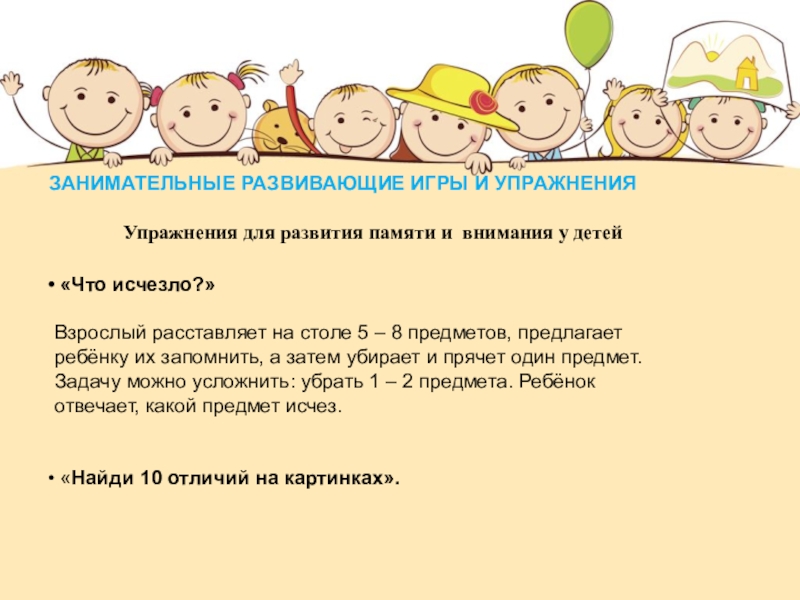 Взрослый расставляет на столе 5 – 8 предметов, предлагает ребёнку их запомнить, а затем убирает и прячет один предмет. Задачу можно усложнить: убрать 1 – 2 предмета. Ребёнок отвечает, какой предмет исчез.