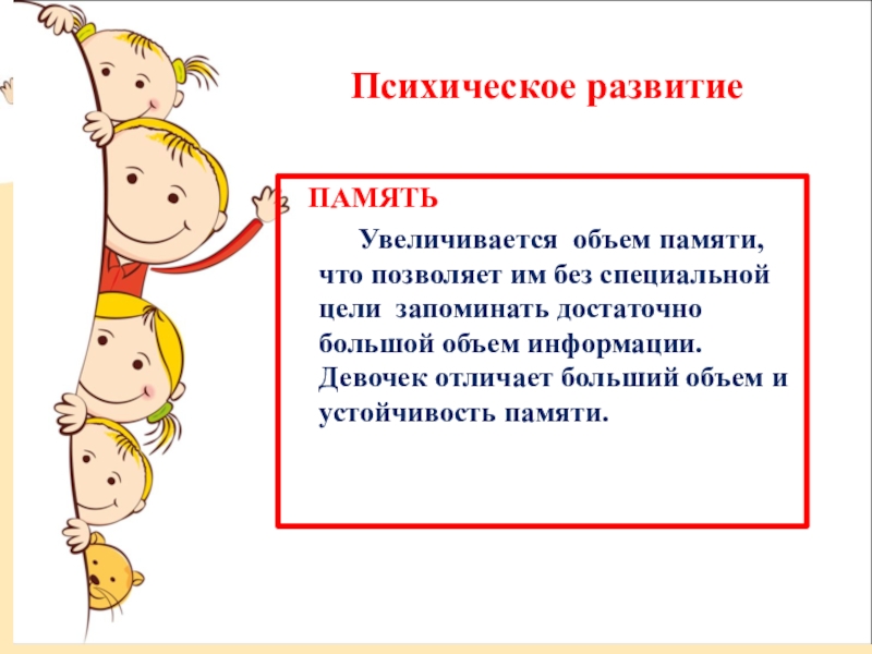что позволяет им без специальной цели запоминать достаточно большой объем информации. Девочек отличает больший объем и устойчивость памяти.