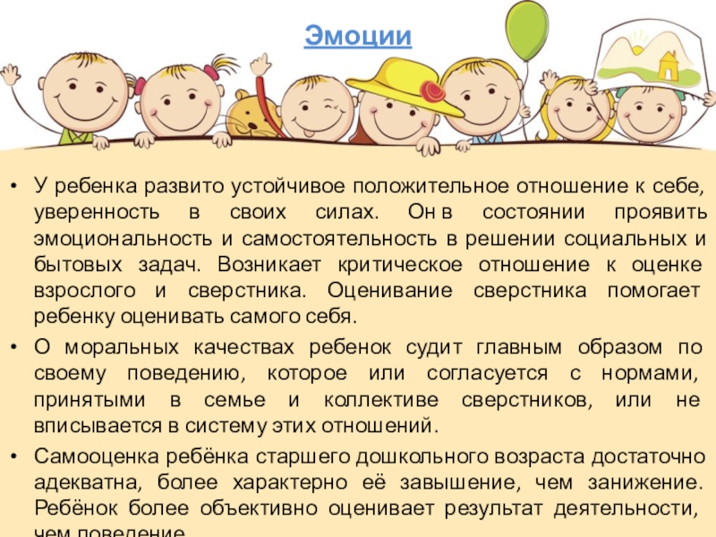 Самооценка ребёнка старшего дошкольного возраста достаточно адекватна, более характерно её завышение, чем занижение. Ребёнок более объективно оценивает результат деятельности, чем поведение.