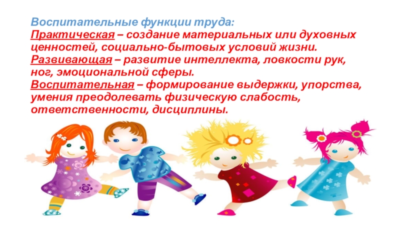 Слайд 7Воспитательные функции труда: Практическая – создание материальных или духовных ценностей, социально-бытовых условий
