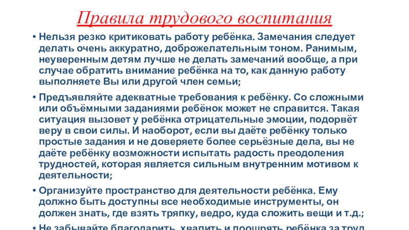 Правила трудового воспитанияНельзя резко критиковать работу ребёнка. Замечания следует делать очень аккуратно, доброжелательным тоном. Ранимым, неуверенным детям