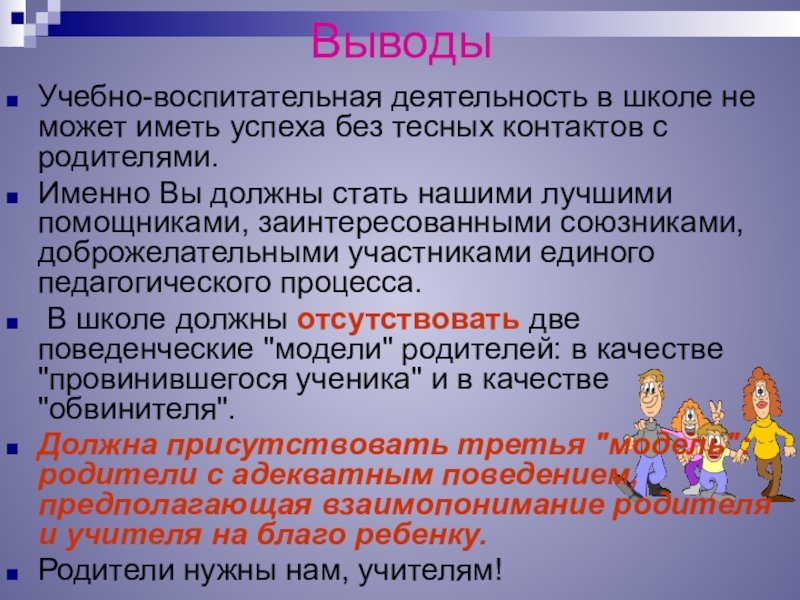 Должна присутствовать третья "модель": родители с адекватным поведением, предполагающая взаимопонимание родителя и учителя на благо ребенку.