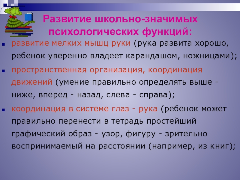 координация в системе глаз - рука (ребенок может правильно перенести в тетрадь простейший графический образ - узор, фигуру - зрительно воспринимаемый на расстоянии (например, из книг);