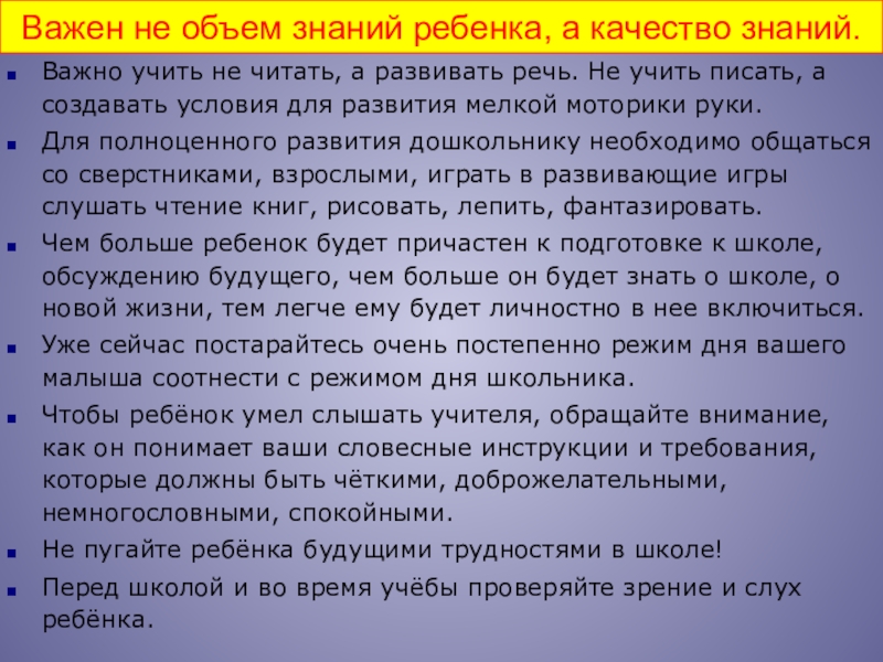 Слайд 10Важен не объем знаний ребенка, а качество знаний.