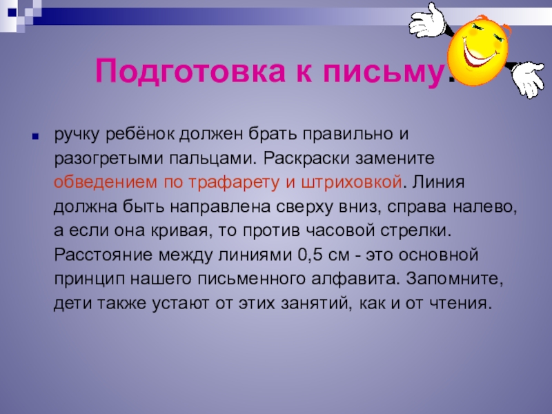 замените обведением по трафарету и штриховкой. Линия должна быть направлена сверху вниз, справа налево, а если она кривая, то против часовой стрелки. Расстояние между линиями 0,5 см - это основной принцип нашего письменного алфавита. Запомните, дети также устают от этих занятий, как и от чтения.