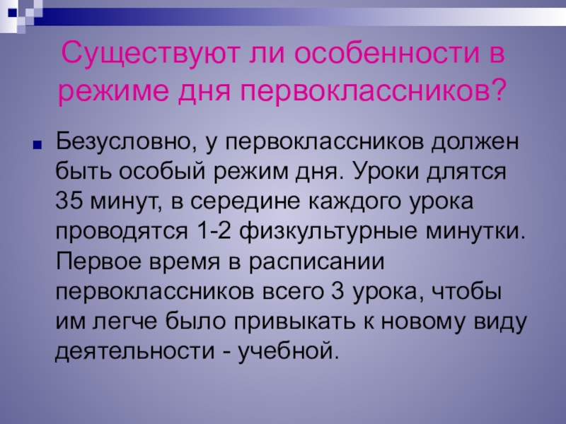 особый режим дня. Уроки длятся 35 минут, в середине каждого урока проводятся 1-2 физкультурные минутки. Первое время в расписании первоклассников всего 3 урока, чтобы им легче было привыкать к новому виду деятельности - учебной.
