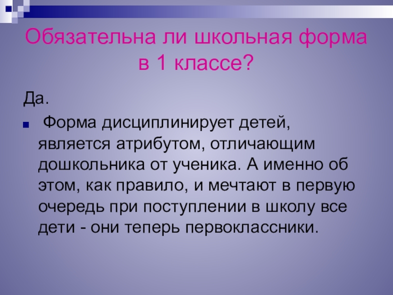 Слайд 17Обязательна ли школьная форма в 1 классе?