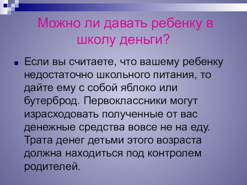 Слайд 22 Можно ли давать ребенку в школу деньги?