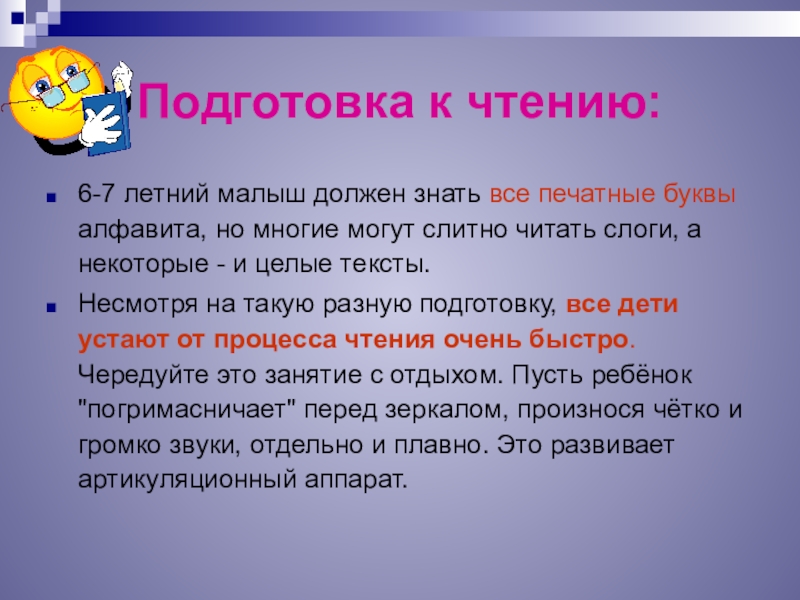 Несмотря на такую разную подготовку, все дети устают от процесса чтения очень быстро. Чередуйте это занятие с отдыхом. Пусть ребёнок "погримасничает" перед зеркалом, произнося чётко и громко звуки, отдельно и плавно. Это развивает артикуляционный аппарат.