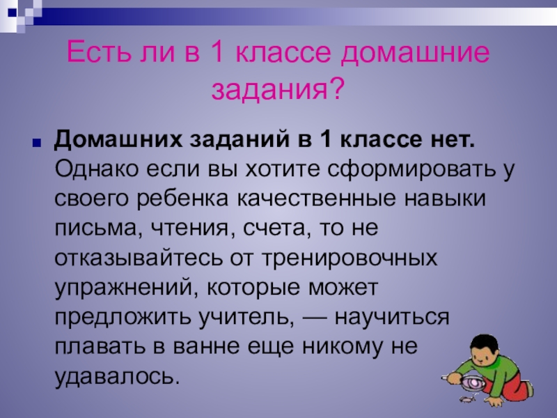 классе нет. Однако если вы хотите сформировать у своего ребенка качественные навыки письма, чтения, счета, то не отказывайтесь от тренировочных упражнений, которые может предложить учитель, — научиться плавать в ванне еще никому не удавалось.