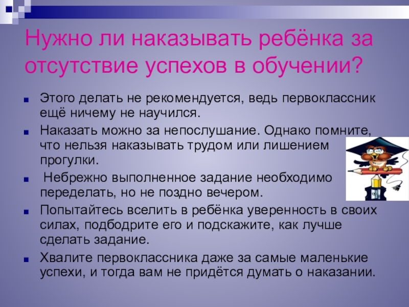 Слайд 30Нужно ли наказывать ребёнка за отсутствие успехов в обучении?