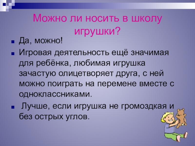 значимая для ребёнка, любимая игрушка зачастую олицетворяет друга, с ней можно поиграть на перемене вместе с одноклассниками.