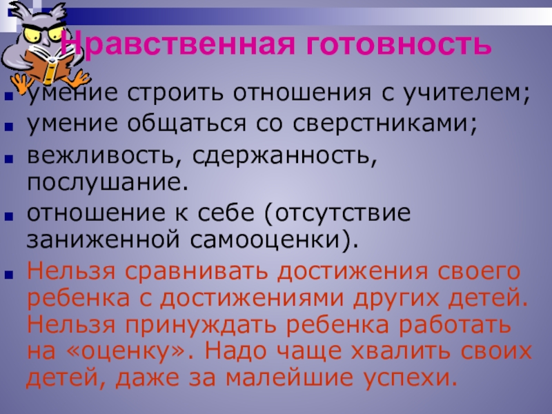 Нельзя сравнивать достижения своего ребенка с достижениями других детей. Нельзя принуждать ребенка работать на «оценку». Надо чаще хвалить своих детей, даже за малейшие успехи.