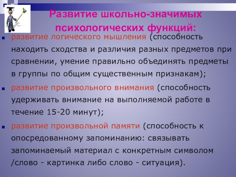 развитие произвольного внимания (способность удерживать внимание на выполняемой работе в течение 15-20 минут);