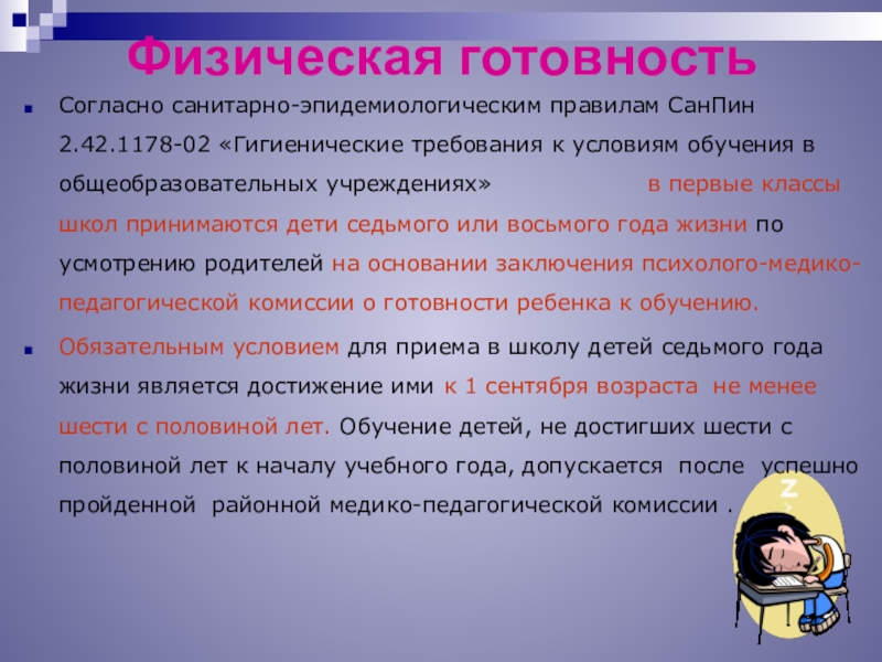 Согласно санитарно-эпидемиологическим правилам СанПин 2.42.1178-02 «Гигиенические требования к условиям обучения