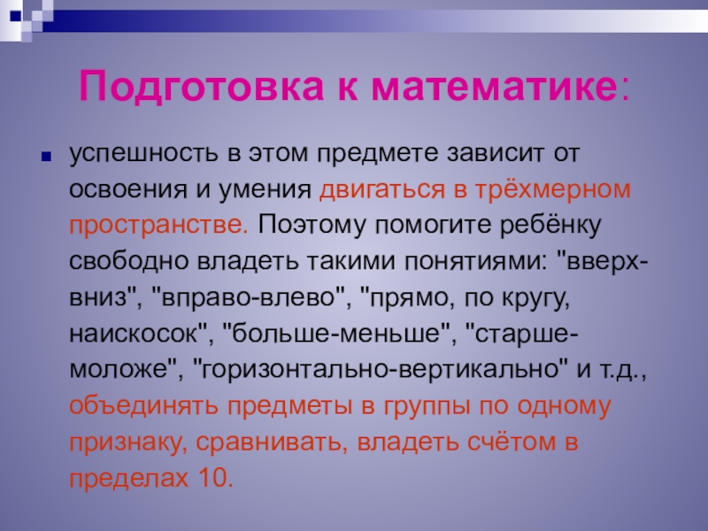 двигаться в трёхмерном пространстве. Поэтому помогите ребёнку свободно владеть такими понятиями: "вверх-вниз", "вправо-влево", "прямо, по кругу, наискосок", "больше-меньше", "старше-моложе", "горизонтально-вертикально" и т.д., объединять предметы в группы по одному признаку, сравнивать, владеть счётом в пределах 10.