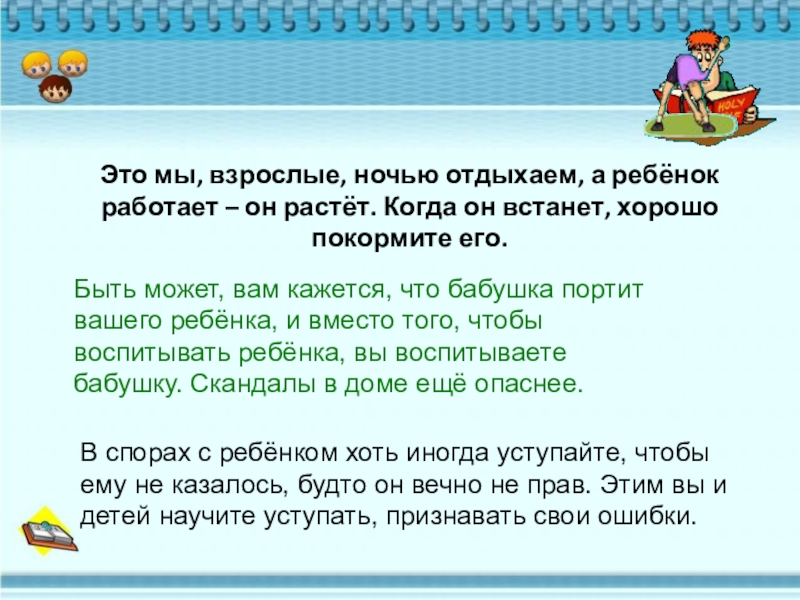 Быть может, вам кажется, что бабушка портит вашего ребёнка, и вместо того, чтобы воспитывать ребёнка, вы воспитываете бабушку. Скандалы в доме ещё опаснее.