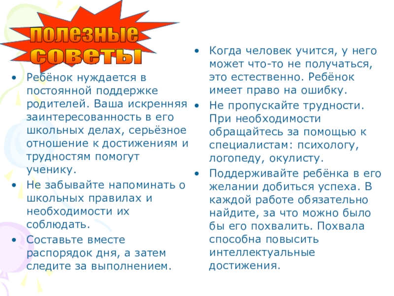 Поддерживайте ребёнка в его желании добиться успеха. В каждой работе обязательно найдите, за что можно было бы его похвалить. Похвала способна повысить интеллектуальные достижения.