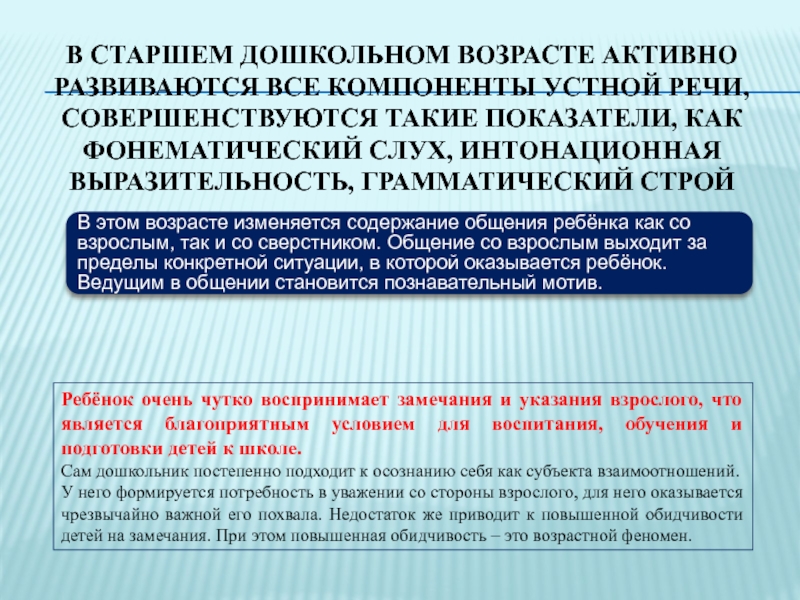 У него формируется потребность в уважении со стороны взрослого, для него оказывается чрезвычайно важной его похвала. Недостаток же приводит к повышенной обидчивости детей на замечания. При этом повышенная обидчивость – это возрастной феномен.