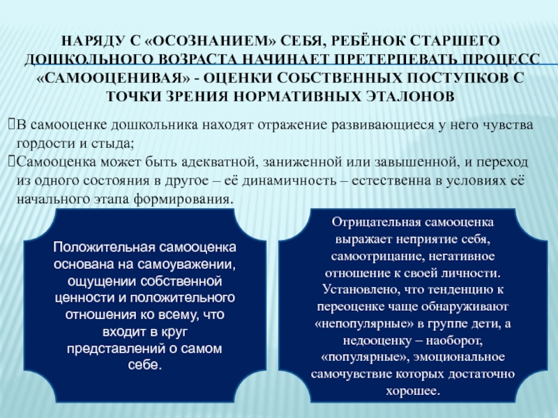 В самооценке дошкольника находят отражение развивающиеся у него чувства гордости и стыда;