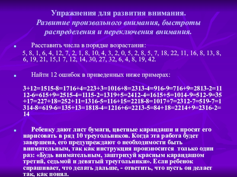 Ребенку дают лист бумаги, цветные карандаши и просят его нарисовать в ряд 10 треугольников. Когда эта работа будет завершена, его предупреждают о необходимости быть внимательным, так как инструкция произносится только один раз: «Будь внимательным, заштрихуй красным карандашом третий, седьмой и девятый треугольники». Если ребенок спрашивает, что делать дальше, - ответить, что пусть он делает так, как понял.
