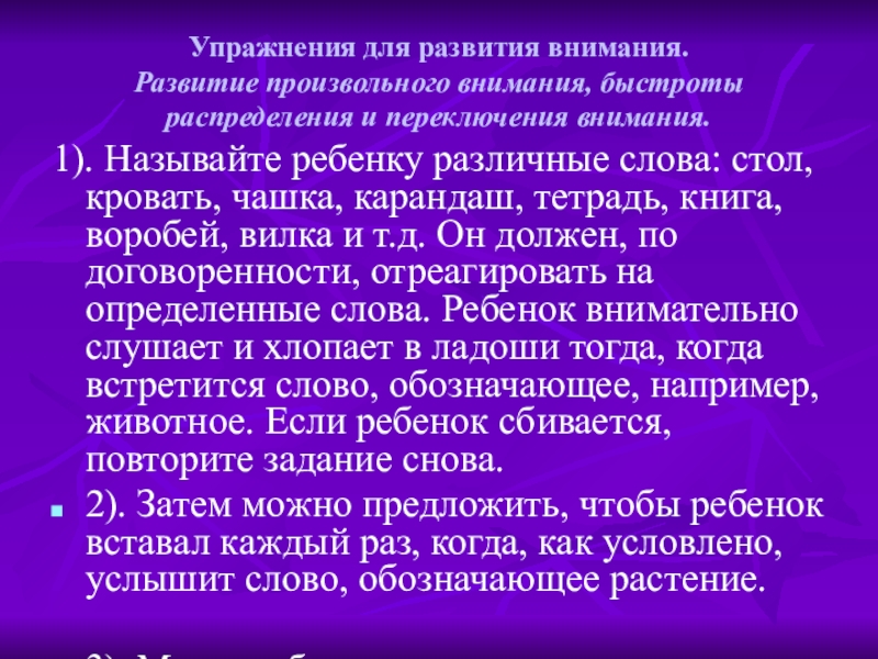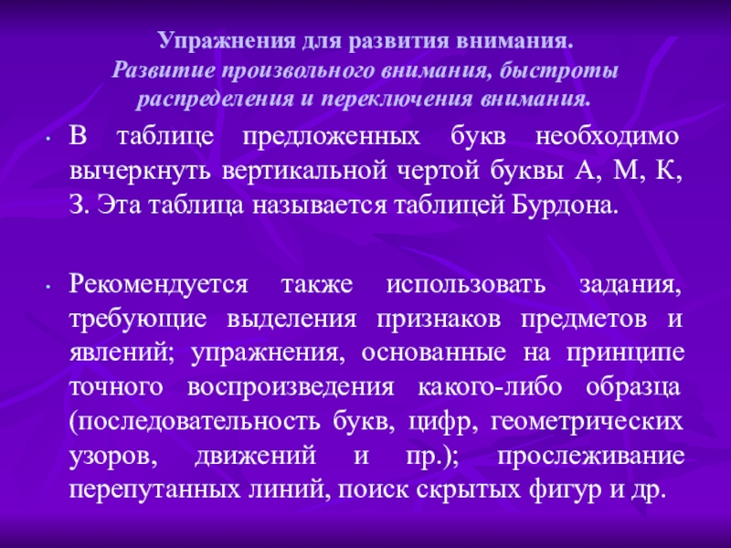 Рекомендуется также использовать задания, требующие выделения признаков предметов и явлений; упражнения, основанные на принципе точного воспроизведения какого-либо образца (последовательность букв, цифр, геометрических узоров, движений и пр.); прослеживание перепутанных линий, поиск скрытых фигур и др.