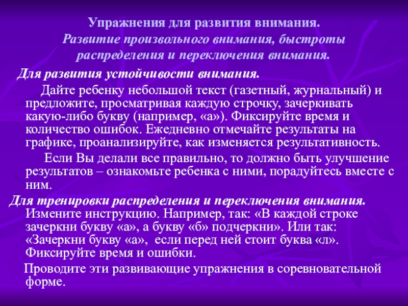 Дайте ребенку небольшой текст (газетный, журнальный) и предложите, просматривая каждую строчку, зачеркивать какую-либо букву (например, «а»). Фиксируйте время и количество ошибок. Ежедневно отмечайте результаты на графике, проанализируйте, как изменяется результативность.
