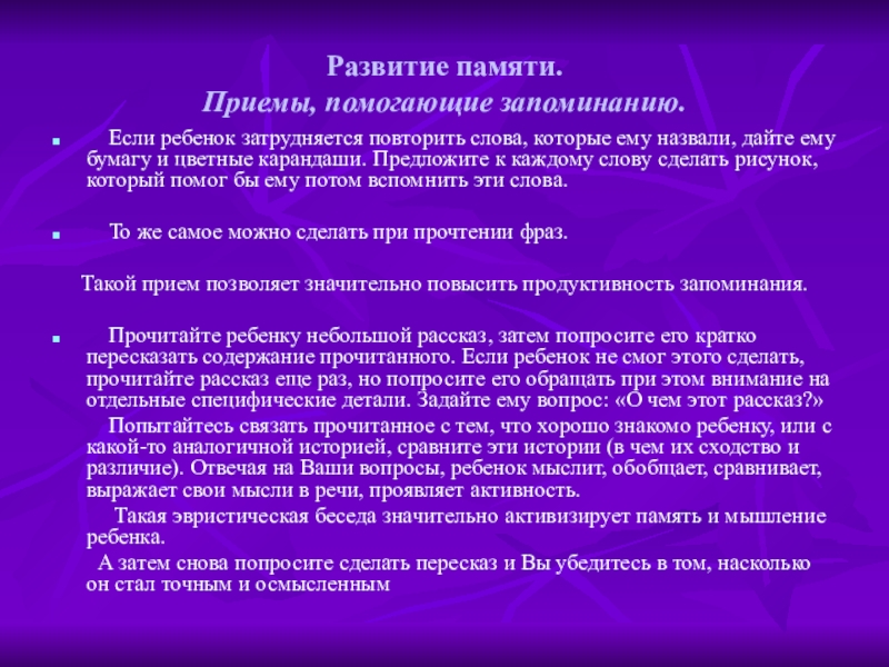 ему назвали, дайте ему бумагу и цветные карандаши. Предложите к каждому слову сделать рисунок, который помог бы ему потом вспомнить эти слова.