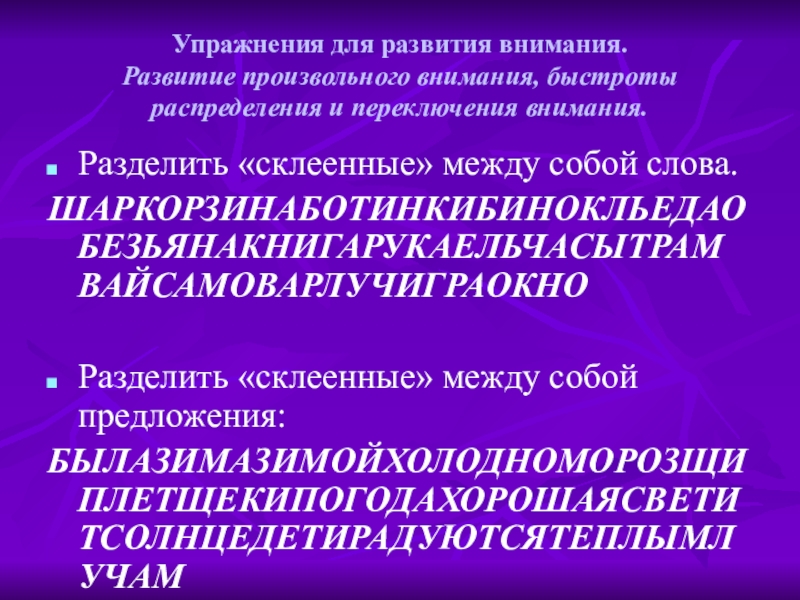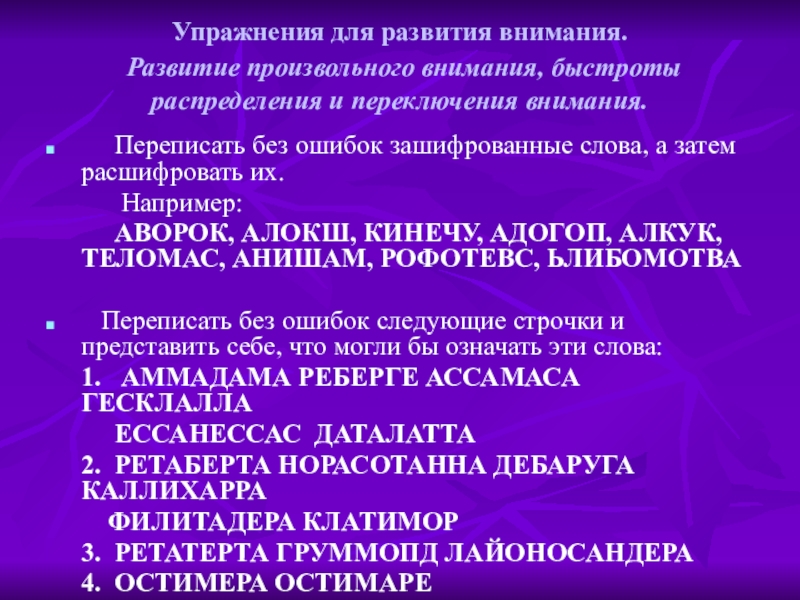 Развитие произвольного внимания, быстроты распределения и переключения внимания.
