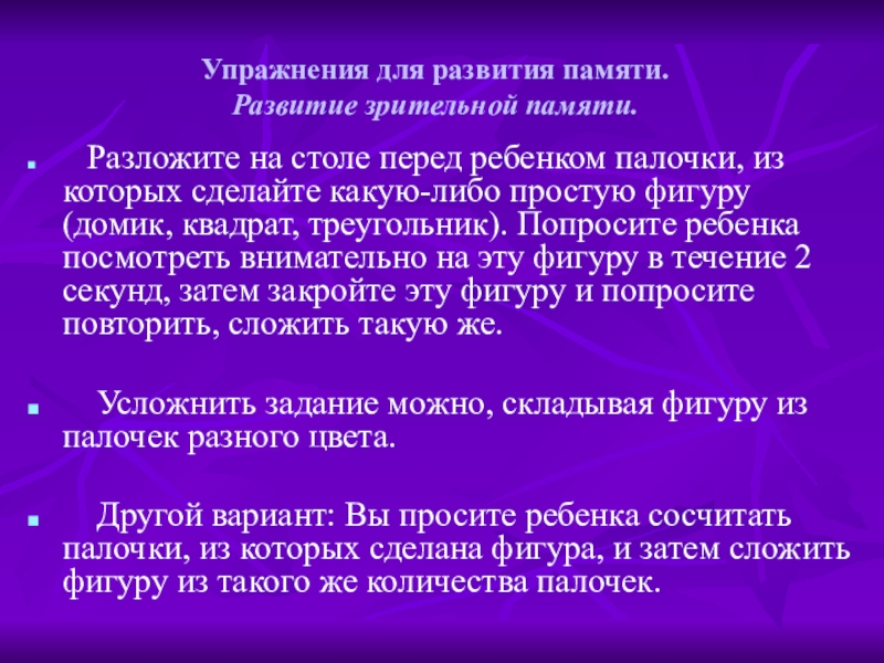 ребенком палочки, из которых сделайте какую-либо простую фигуру (домик, квадрат, треугольник). Попросите ребенка посмотреть внимательно на эту фигуру в течение 2 секунд, затем закройте эту фигуру и попросите повторить, сложить такую же.