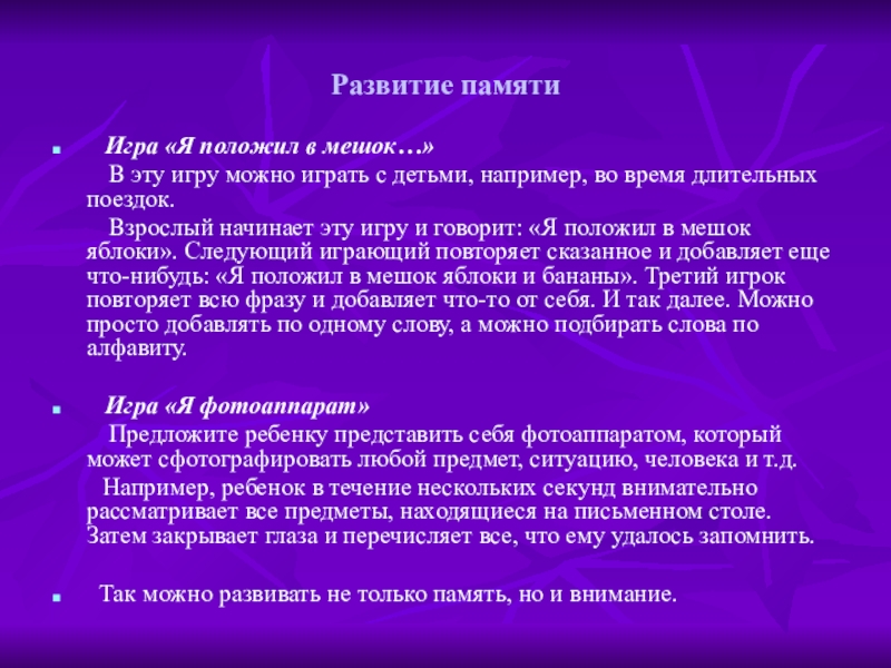 Взрослый начинает эту игру и говорит: «Я положил в мешок яблоки». Следующий играющий повторяет сказанное и добавляет еще что-нибудь: «Я положил в мешок яблоки и бананы». Третий игрок повторяет всю фразу и добавляет что-то от себя. И так далее. Можно просто добавлять по одному слову, а можно подбирать слова по алфавиту.