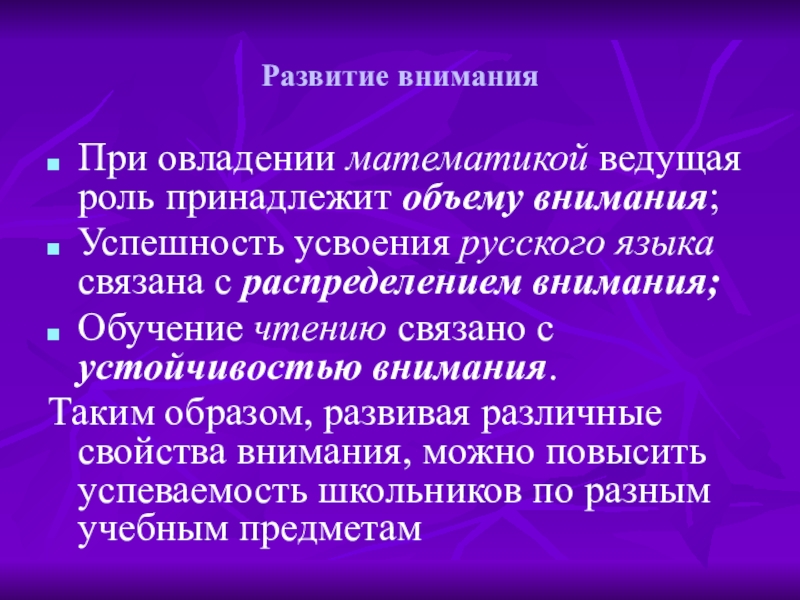 Таким образом, развивая различные свойства внимания, можно повысить успеваемость школьников по разным учебным предметам
