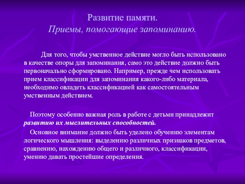 того, чтобы умственное действие могло быть использовано в качестве опоры для запоминания, само это действие должно быть первоначально сформировано. Например, прежде чем использовать прием классификации для запоминания какого-либо материала, необходимо овладеть классификацией как самостоятельным умственным действием.