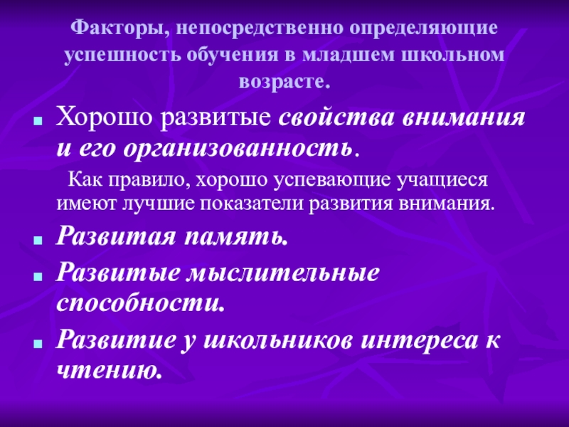 Слайд 3Факторы, непосредственно определяющие успешность обучения в младшем школьном возрасте.