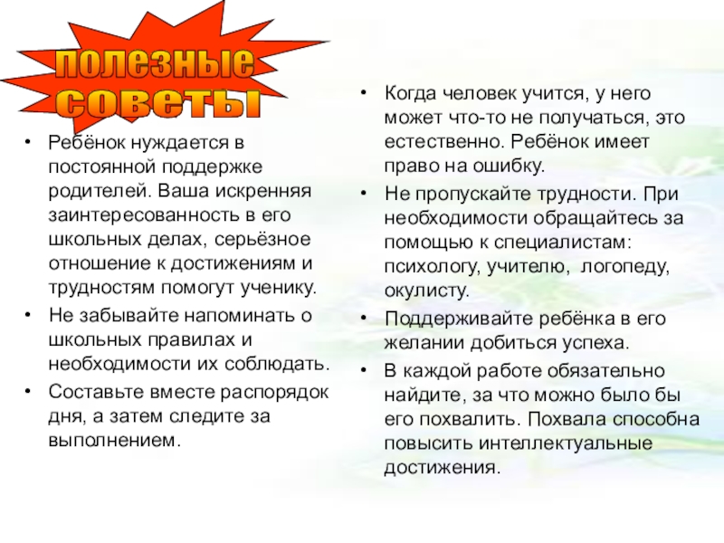 Не пропускайте трудности. При необходимости обращайтесь за помощью к специалистам: психологу, учителю, логопеду, окулисту.