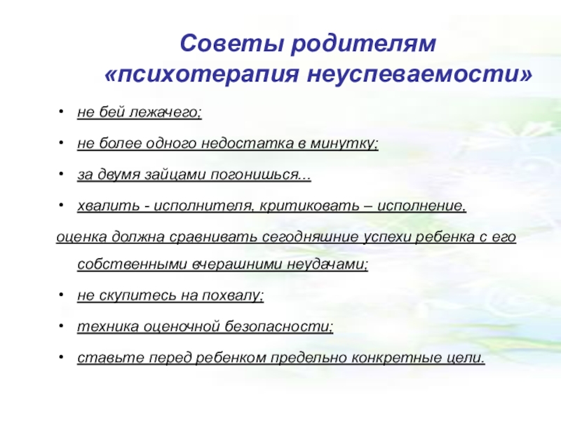 В каждой работе обязательно найдите, за что можно было бы его похвалить. Похвала способна повысить интеллектуальные достижения.