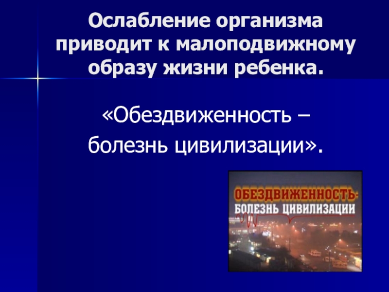 Слайд 31Ослабление организма приводит к малоподвижному образу жизни ребенка.