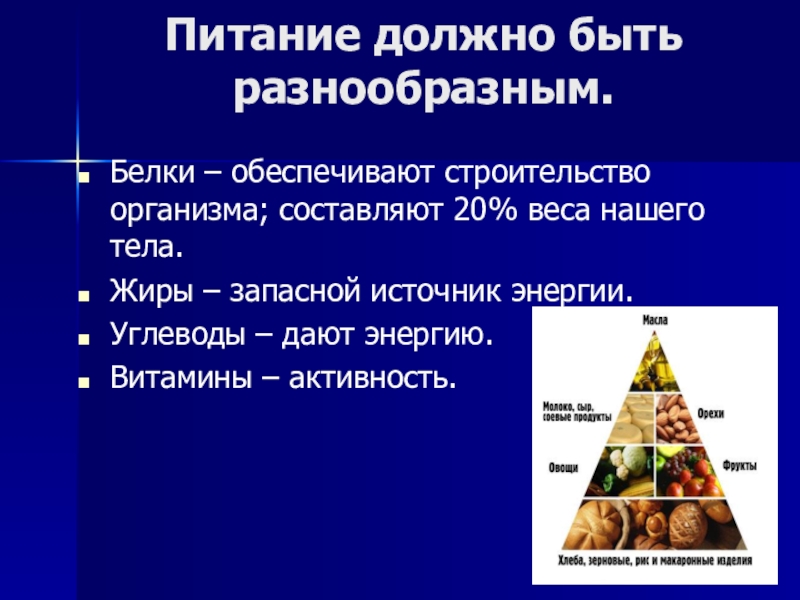 Белки – обеспечивают строительство организма; составляют 20% веса