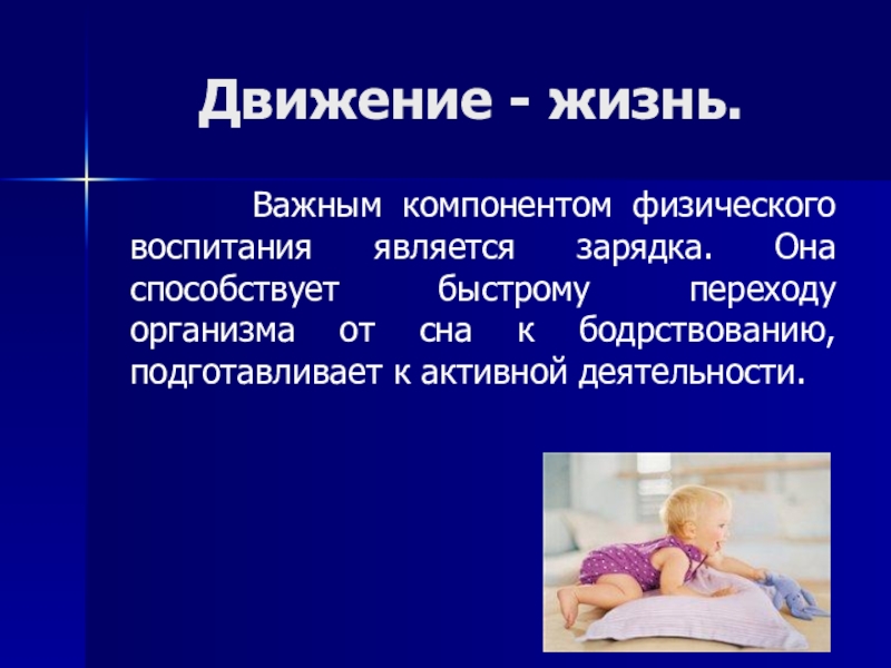 зарядка. Она способствует быстрому переходу организма от сна к бодрствованию, подготавливает к активной деятельности.
