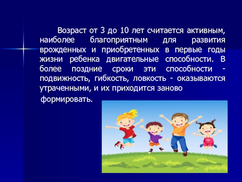 считается активным, наиболее благоприятным для развития врожденных и приобретенных в первые годы жизни ребенка двигательные способности. В более поздние сроки эти способности - подвижность, гибкость, ловкость - оказываются утраченными, и их приходится заново
