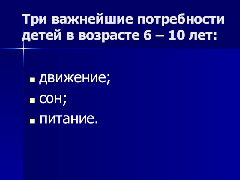 Слайд 7Три важнейшие потребности детей в возрасте 6 – 10 лет:
