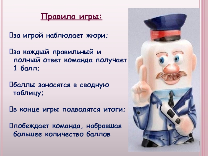 Правила игры: за игрой наблюдает жюри; за каждый правильный и полный ответ команда получает 1 балл;баллы заносятся