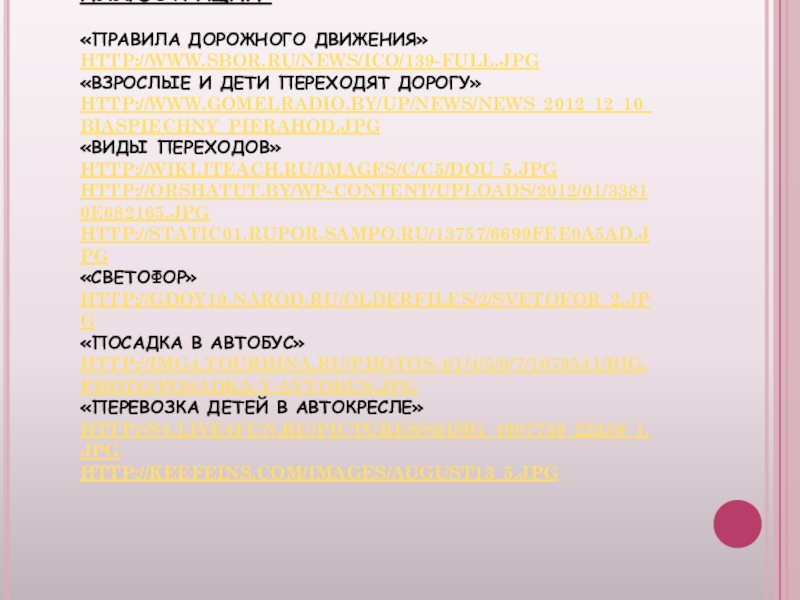 Слайд 19 ИЛЛЮСТРАЦИИ: «ПРАВИЛА ДОРОЖНОГО ДВИЖЕНИЯ» HTTP://WWW.SBOR.RU/NEWS/ICO/139-FULL.JPG «ВЗРОСЛЫЕ И ДЕТИ ПЕРЕХОДЯТ ДОРОГУ» HTTP://WWW.GOMELRADIO.BY/UP/NEWS/NEWS_2012_12_10_BIASPIECHNY_PIERAHOD.JPG «ВИДЫ ПЕРЕХОДОВ» HTTP://WIKI.ITEACH.RU/IMAGES/C/C5/DOU_5.JPG HTTP://ORSHATUT.BY/WP-CONTENT/UPLOADS/2012/01/33810E682165.JPG HTTP://STATIC01.RUPOR.SAMPO.RU/13757/6699FEE0A5AD.JPG «СВЕТОФОР» HTTP://GDOY19.NAROD.RU/OLDERFILES/2/SVETOFOR_2.JPG
