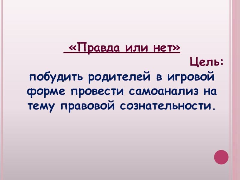 «Правда или нет»Цель: побудить родителей в игровой форме провести самоанализ на тему правовой сознательности.