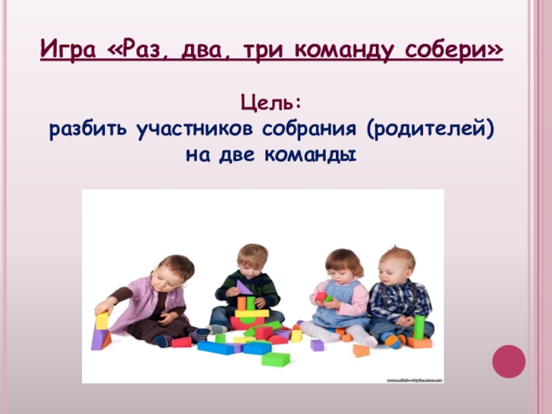 Игра «Раз, два, три команду собери»Цель: разбить участников собрания (родителей) на две команды