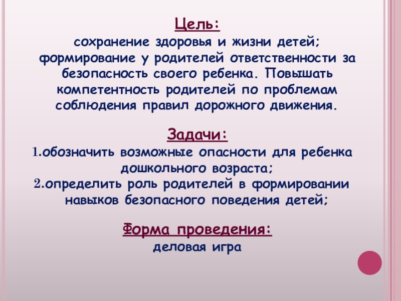 Цель: сохранение здоровья и жизни детей; формирование у родителей ответственности за безопасность своего ребенка. Повышать компетентность родителей