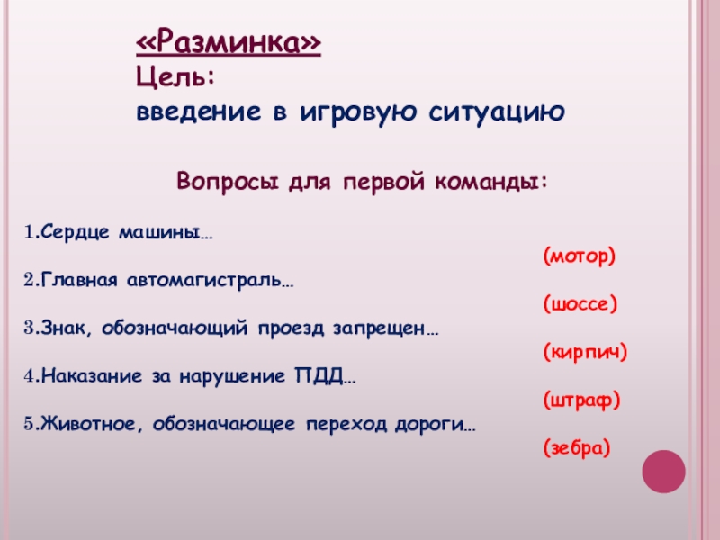 «Разминка»Цель: введение в игровую ситуацию Вопросы для первой команды:Сердце машины…