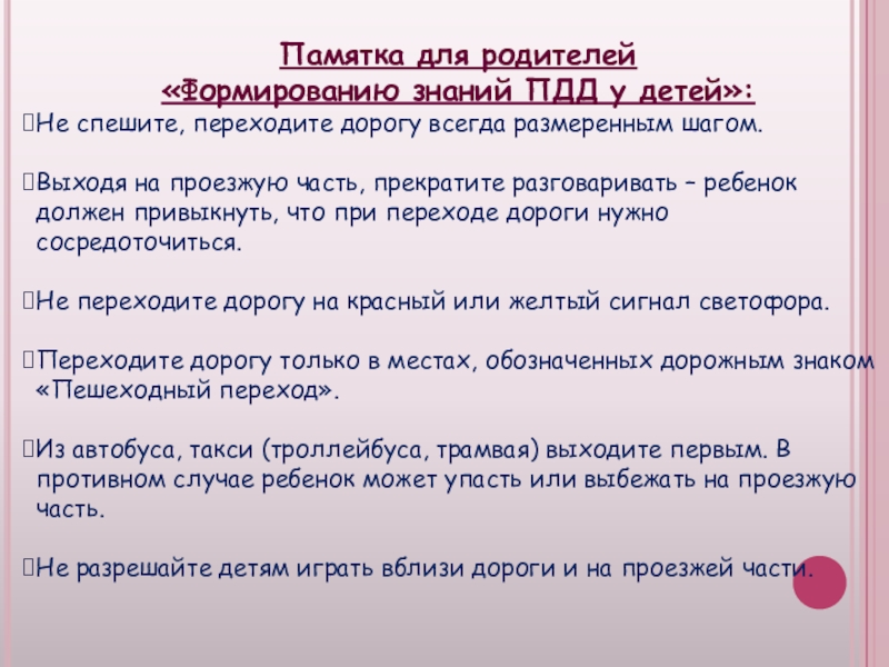 Памятка для родителей «Формированию знаний ПДД у детей»:Не спешите, переходите дорогу всегда размеренным шагом.Выходя на проезжую часть,