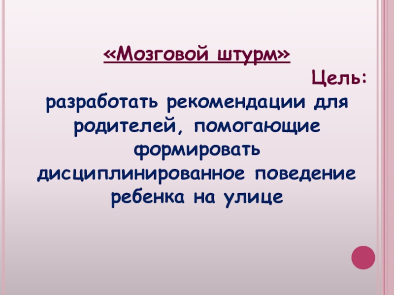 «Мозговой штурм» Цель: разработать рекомендации для родителей, помогающие формировать дисциплинированное поведение ребенка на улице