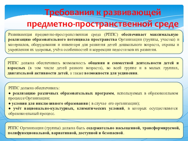 РППС Организации (группы) должна быть содержательно насыщенной, трансформируемой, полифункциональной, вариативной, доступной и безопасной.